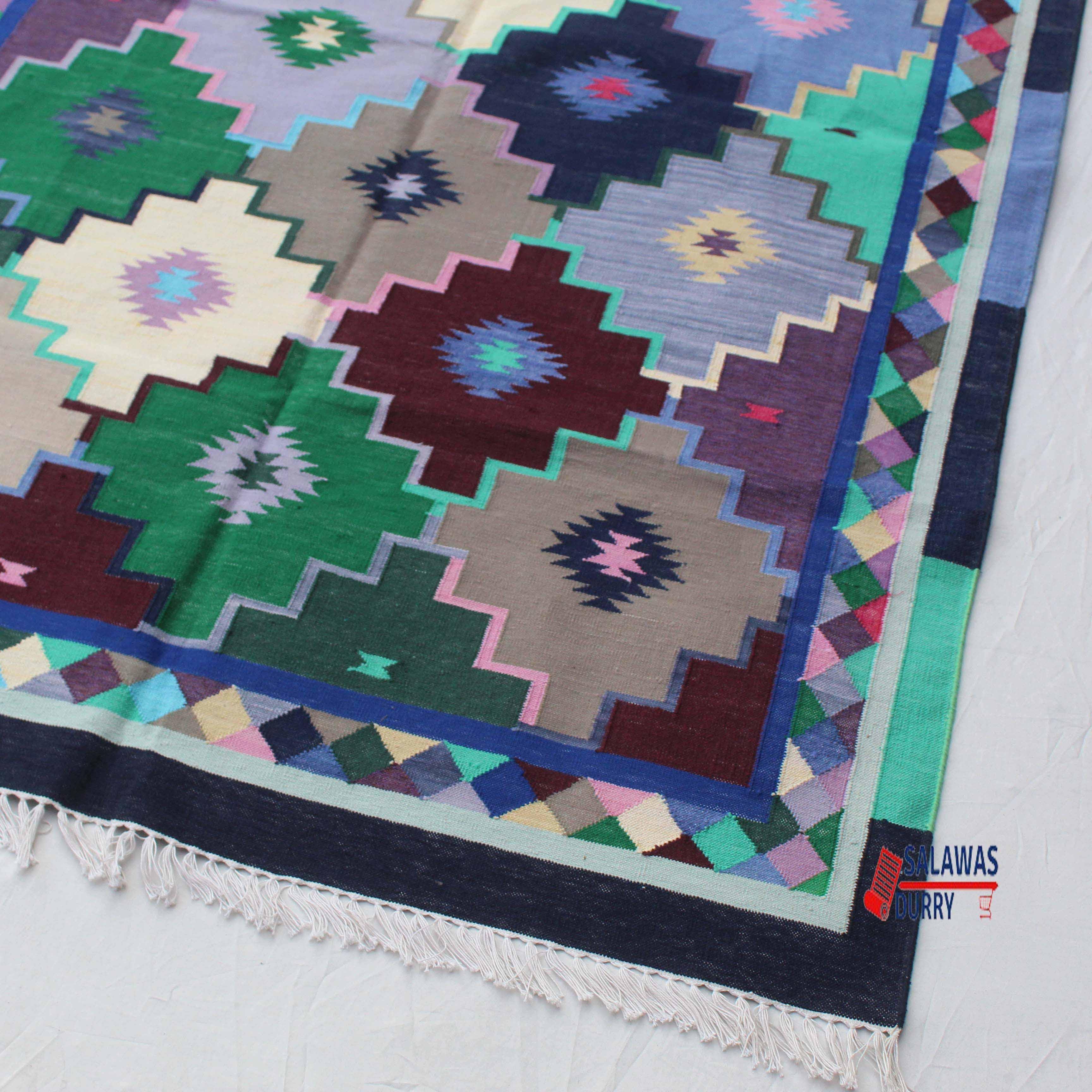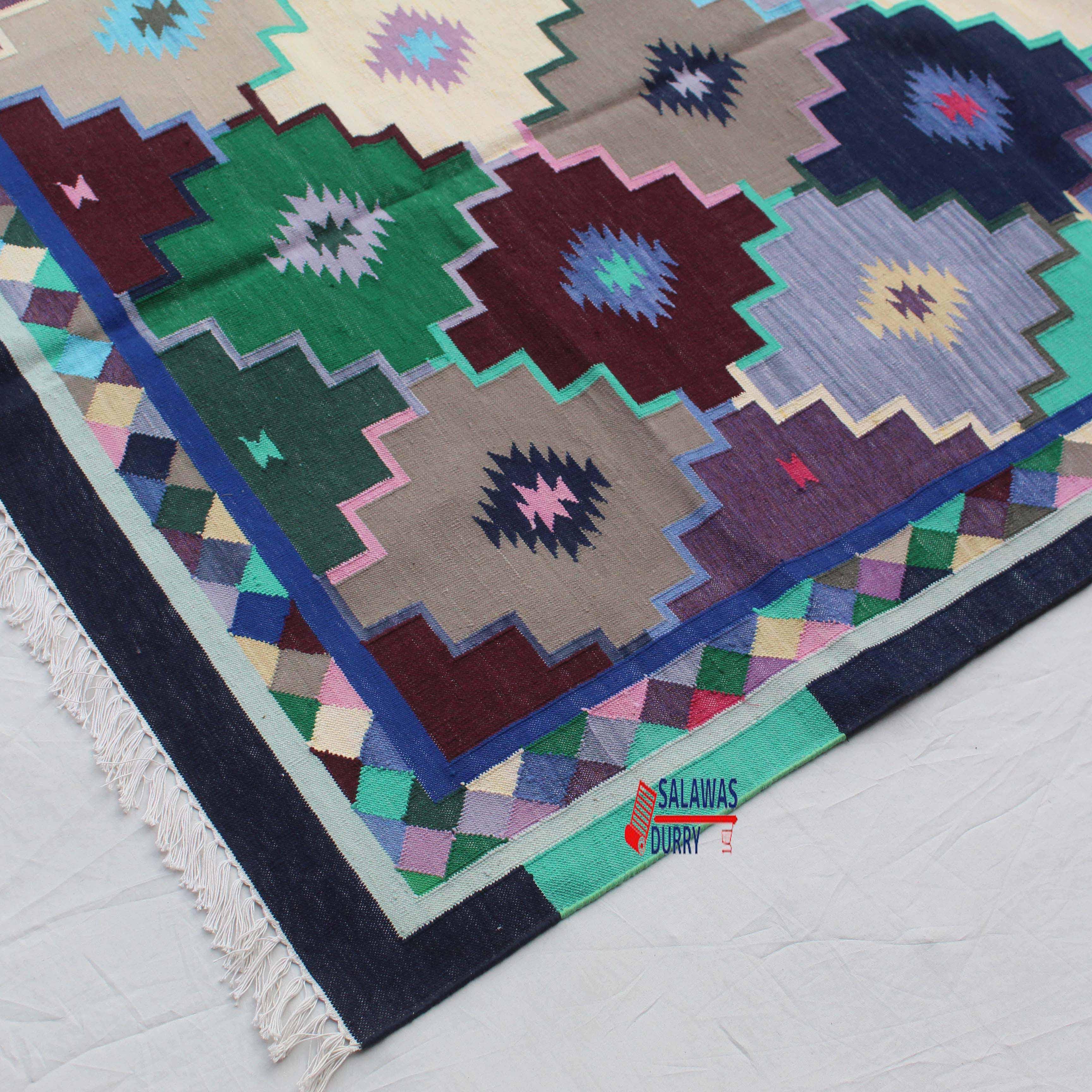 This Colorful Geometric Dhurrie Rug is perfect for enhancing the aesthetic appeal of living rooms, bedrooms, dining areas, or any other space in need of a pop of color and pattern. The reversible design allows you to change the appearance of the rug as desired, ensuring it complements your decor scheme effortlessly.