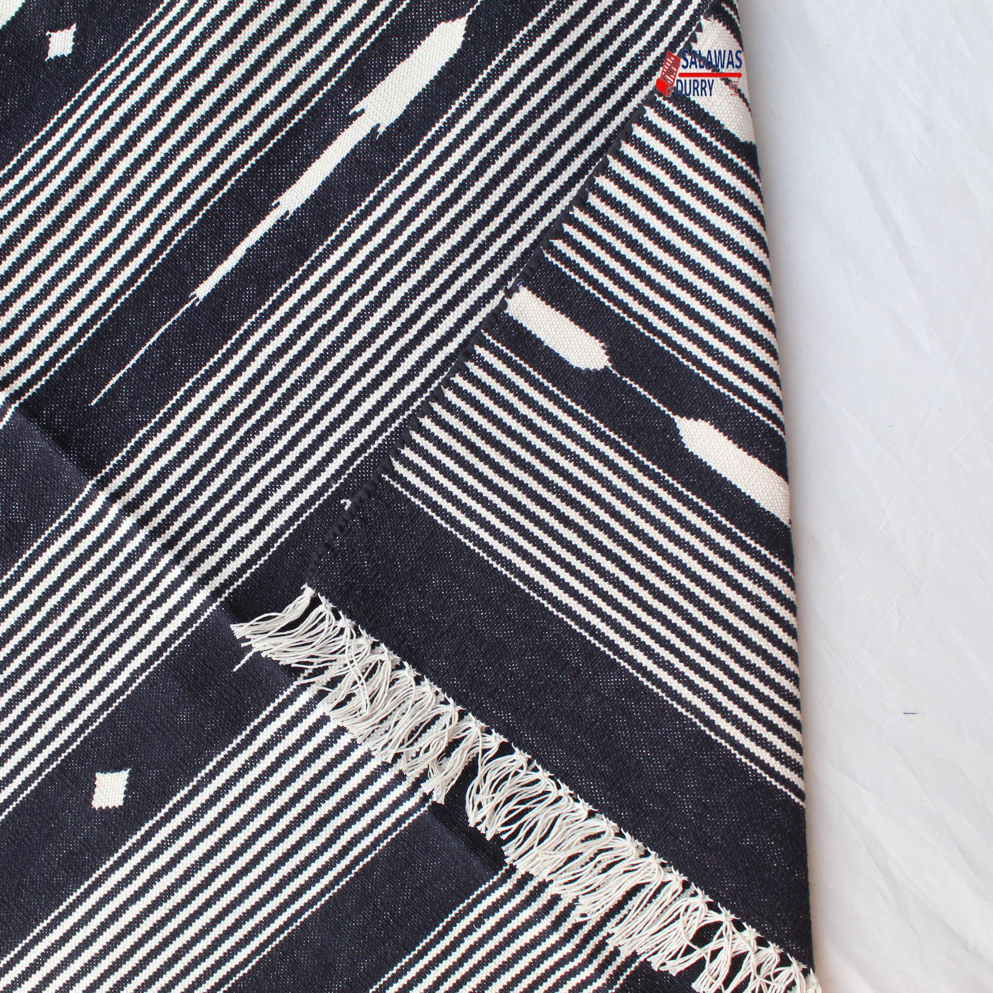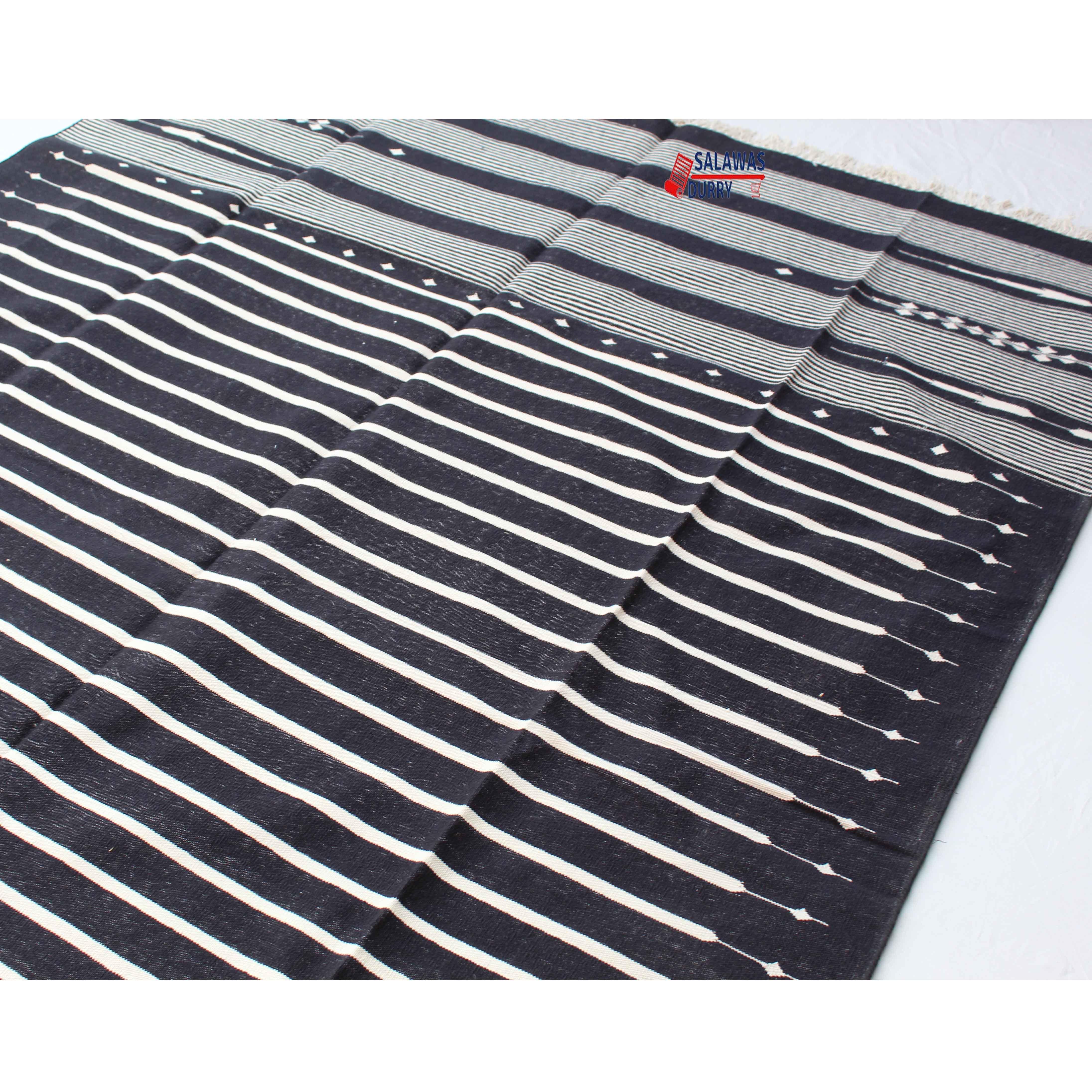 The 6X9 Black Hand Woven Stripes Geometric High Quality Cotton Flatweave Rug is a stunning addition to any space. This rug, handmade in India, is inspired by modern contemporary lifestyles and arts. Measuring 6 feet in width and 9 feet in length, it features a beautiful geometric design that adds a touch of sophistication to the room.