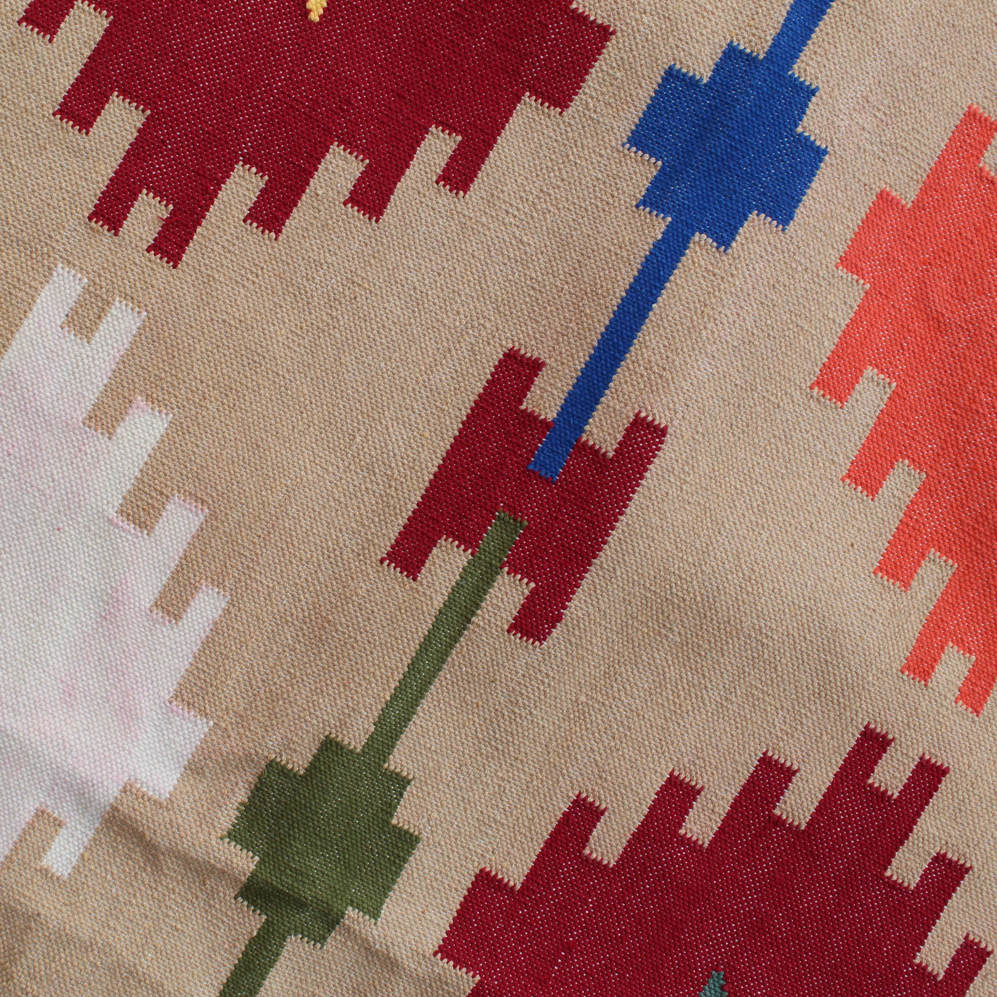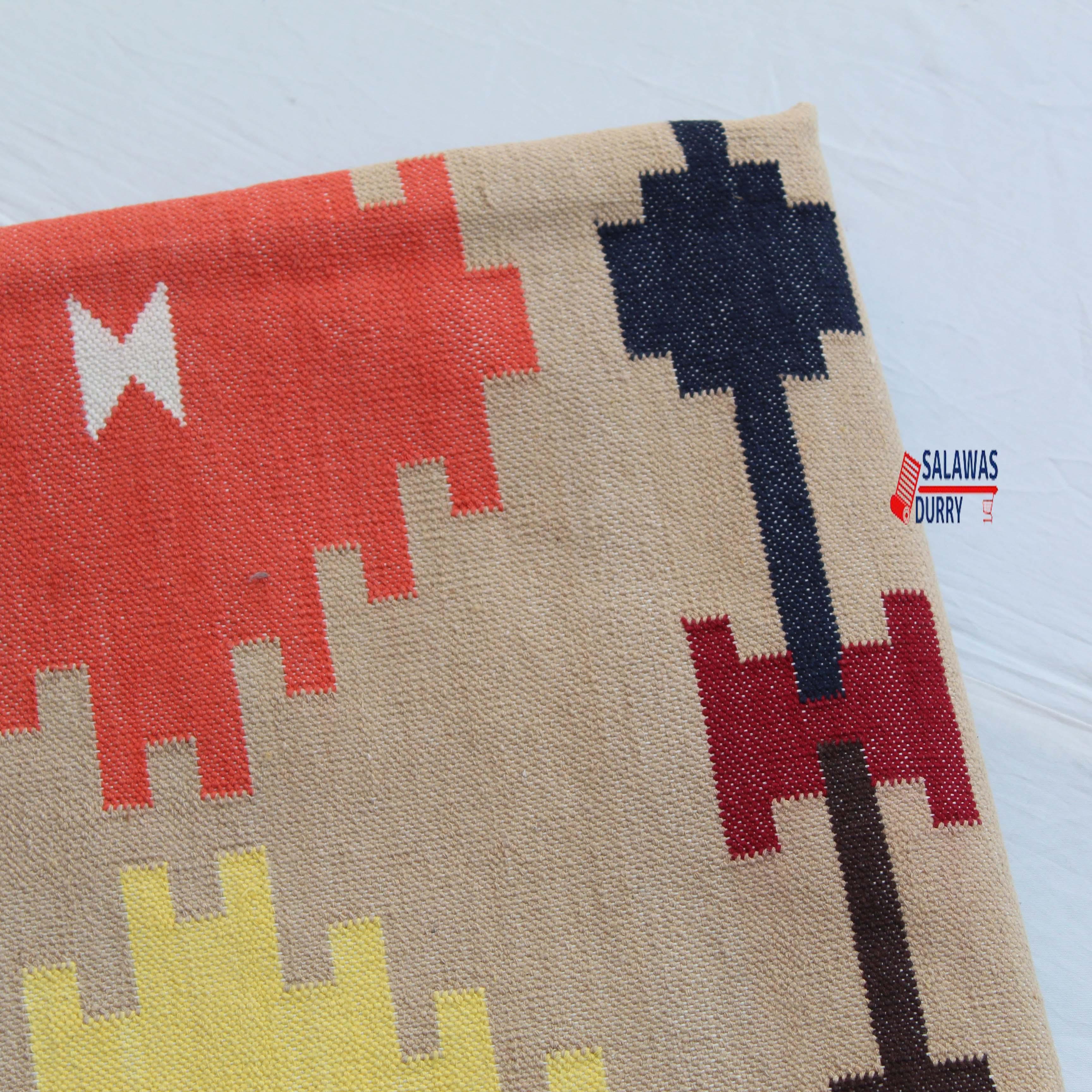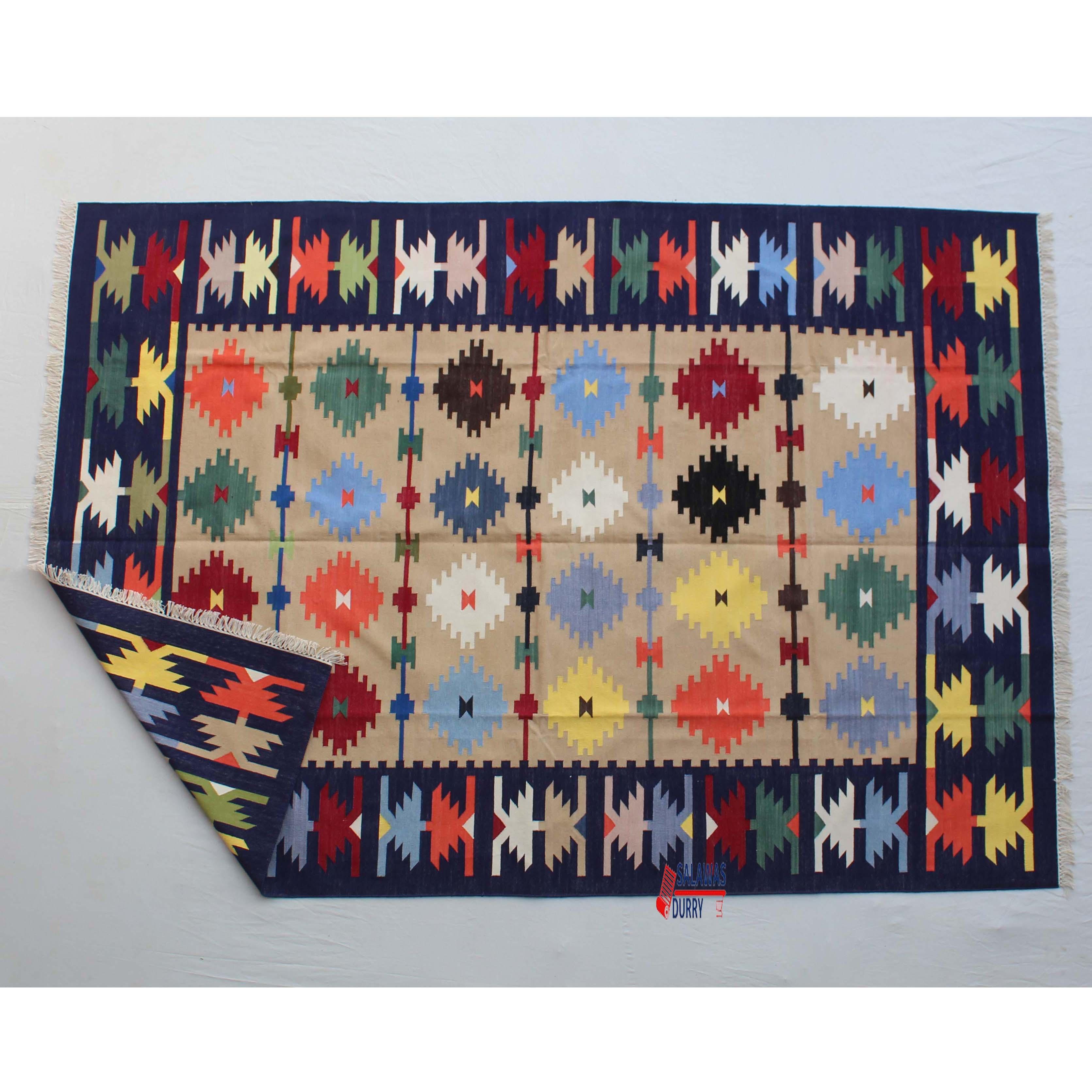 Introducing our exquisite 6x9 Colorful Cotton Handmade Royal Design Rug, a stunning addition to any home decor. This beautiful rug features a flat weave and is hand woven with precision using traditional loom techniques.