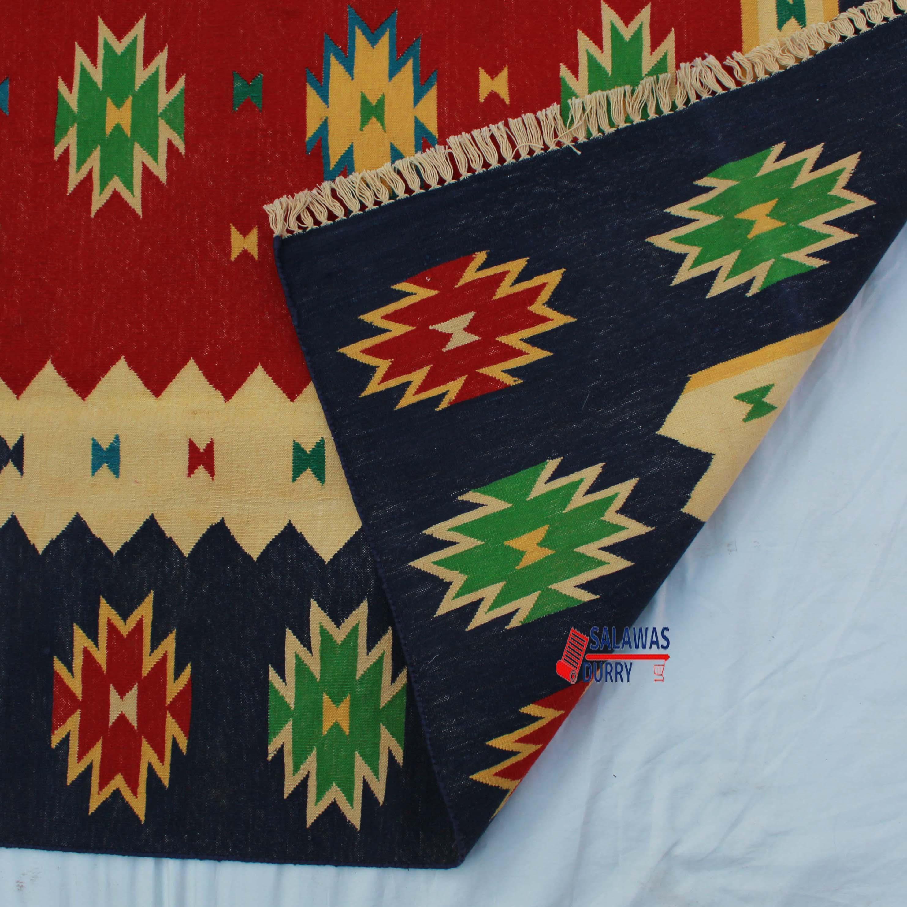 Introducing our exquisite 6x9 Red And Dark Blue Cotton Handmade Royal Design Rug, a stunning addition to any home decor. This beautiful rug features a flat weave and is hand woven with precision using traditional loom techniques. It is crafted from strong cotton threads, ensuring durability and longevity.