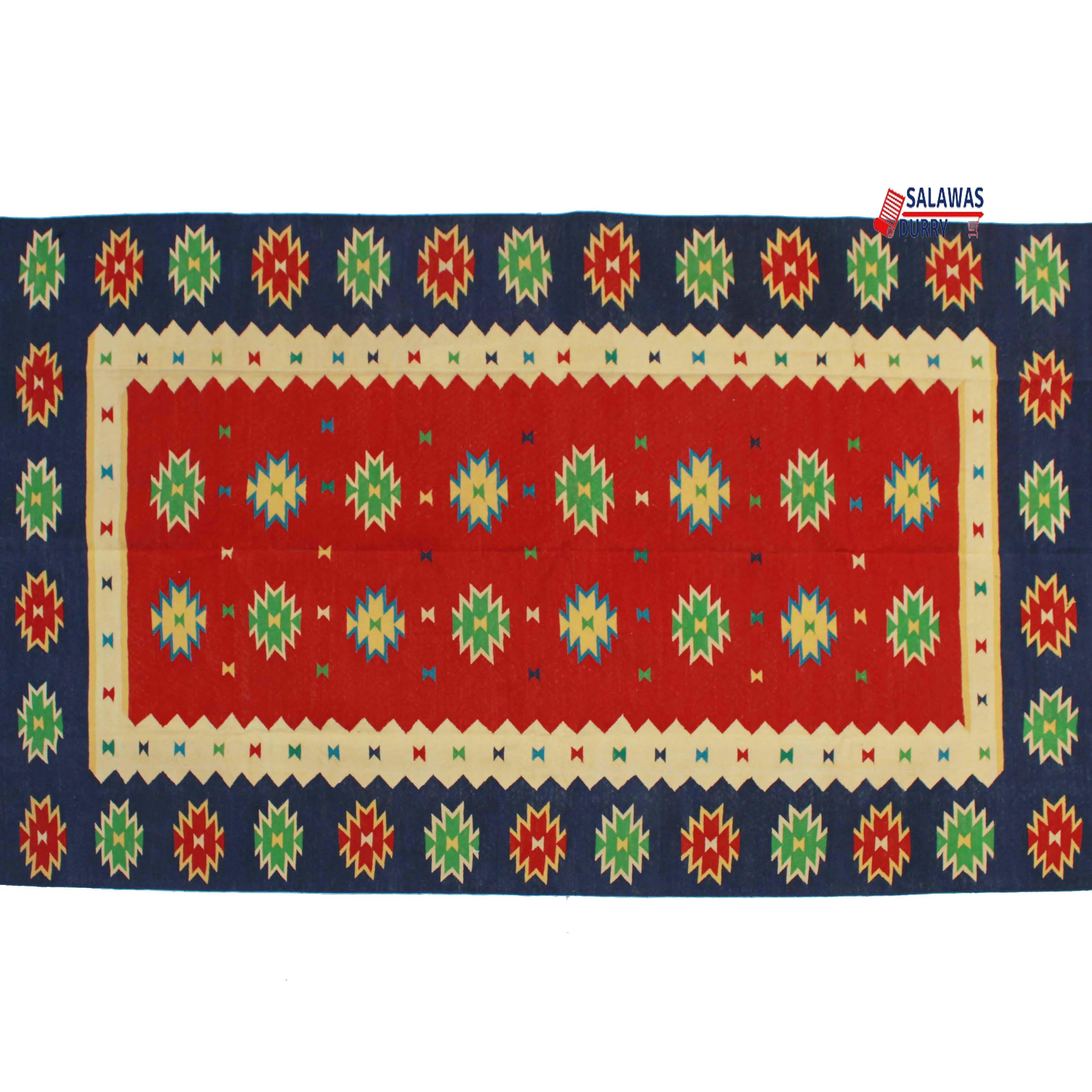 Introducing our exquisite 6x9 Red And Dark Blue Cotton Handmade Royal Design Rug, a stunning addition to any home decor. This beautiful rug features a flat weave and is hand woven with precision using traditional loom techniques.