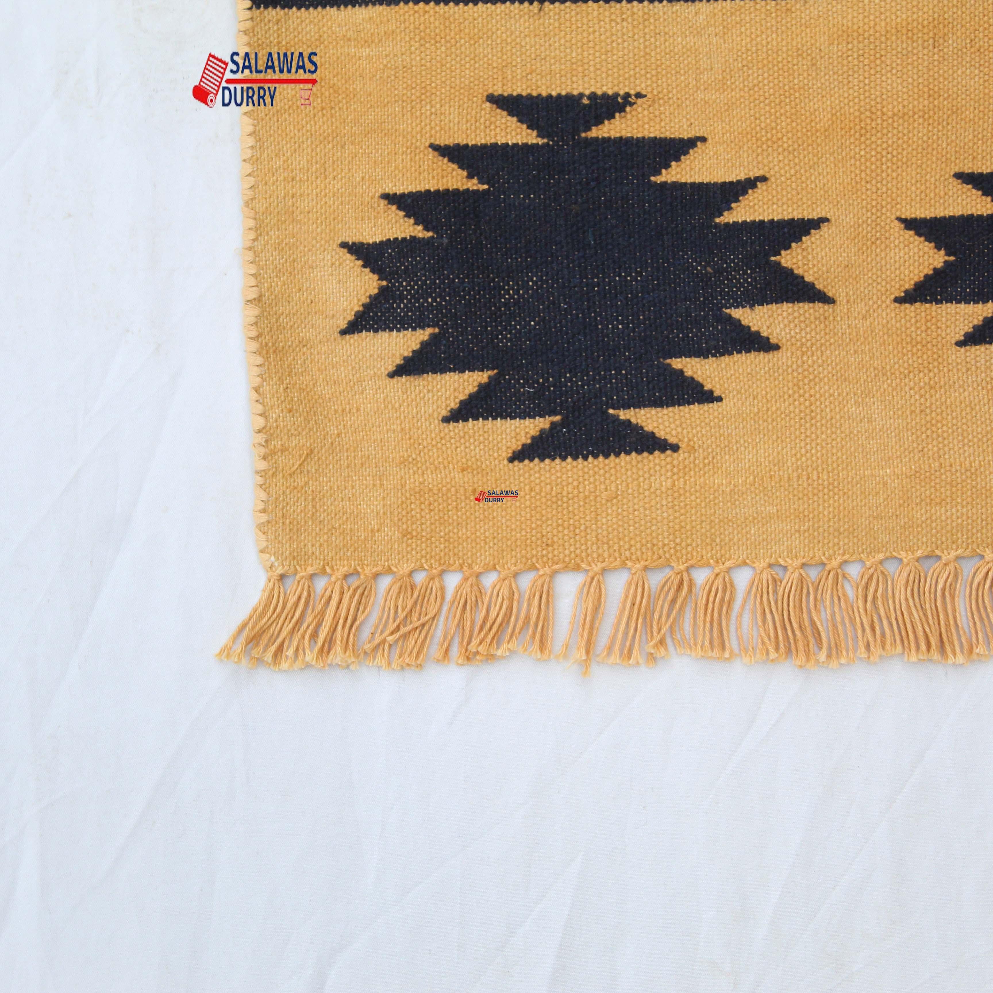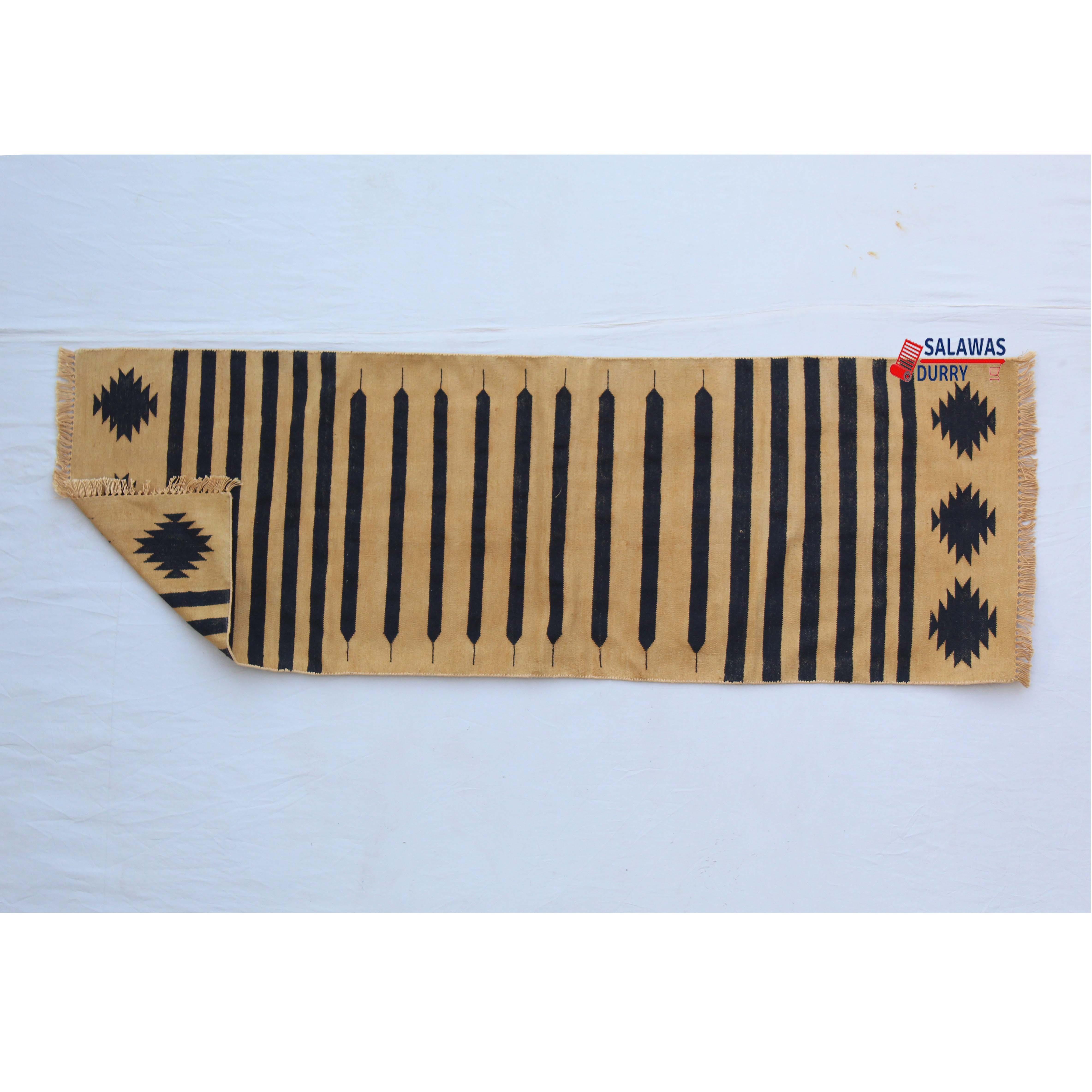 Introducing our exquisite Multiple Sizes Cotton  Dark Blue And Golden Yellow Modern Stripes Handwoven Runner Rug! This reversible runner kilim rug is skillfully handcrafted, making it a unique and eye-catching addition to your home decor. Made from premium quality cotton materials, this runner rug offers both durability and comfort.