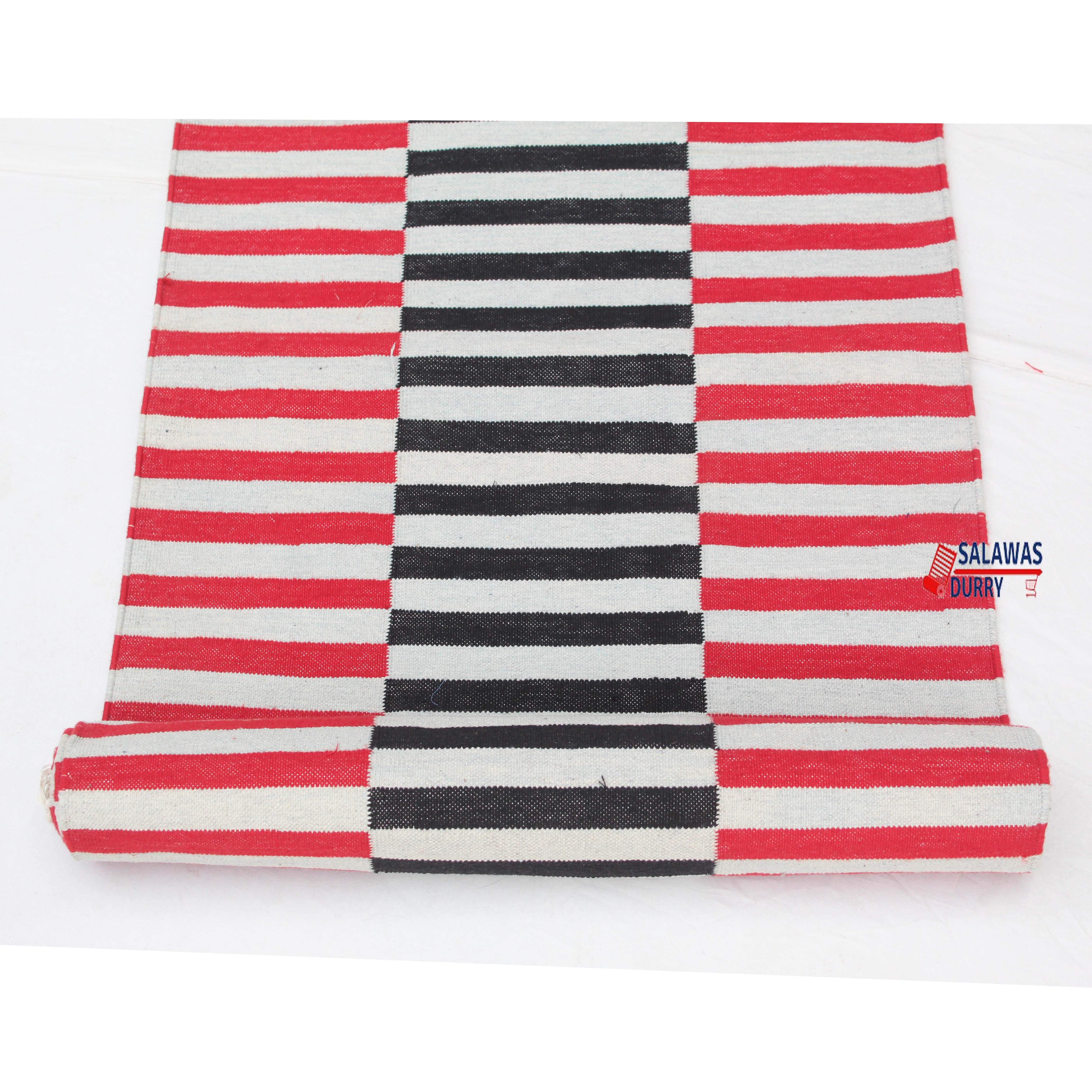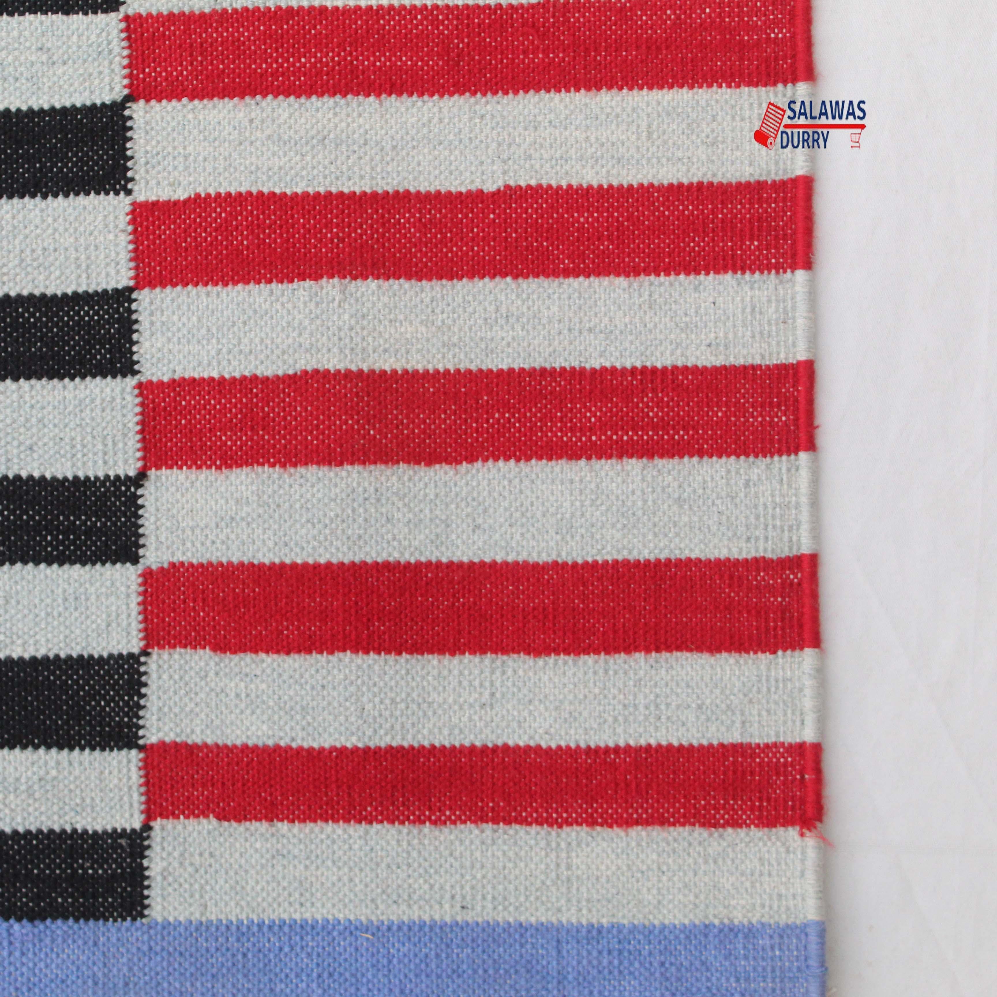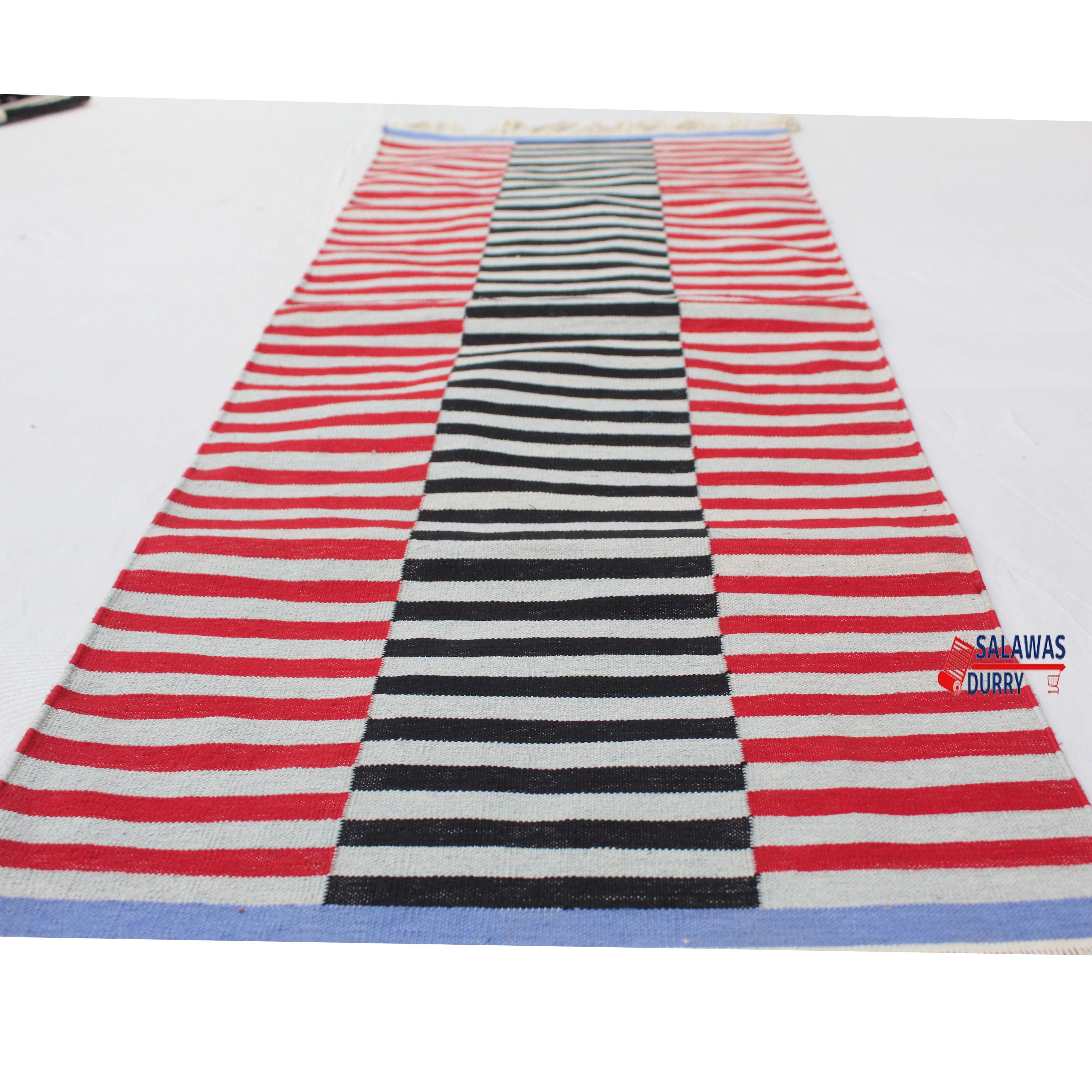 Introducing our exquisite Multiple Sizes Cotton Red And Gray, Blue Modern Stripes Handwoven Runner Rug! This reversible runner kilim rug is skillfully handcrafted, making it a unique and eye-catching addition to your home decoor. Made from premium quality cotton materials, this runner rug offers both durability and comfort.