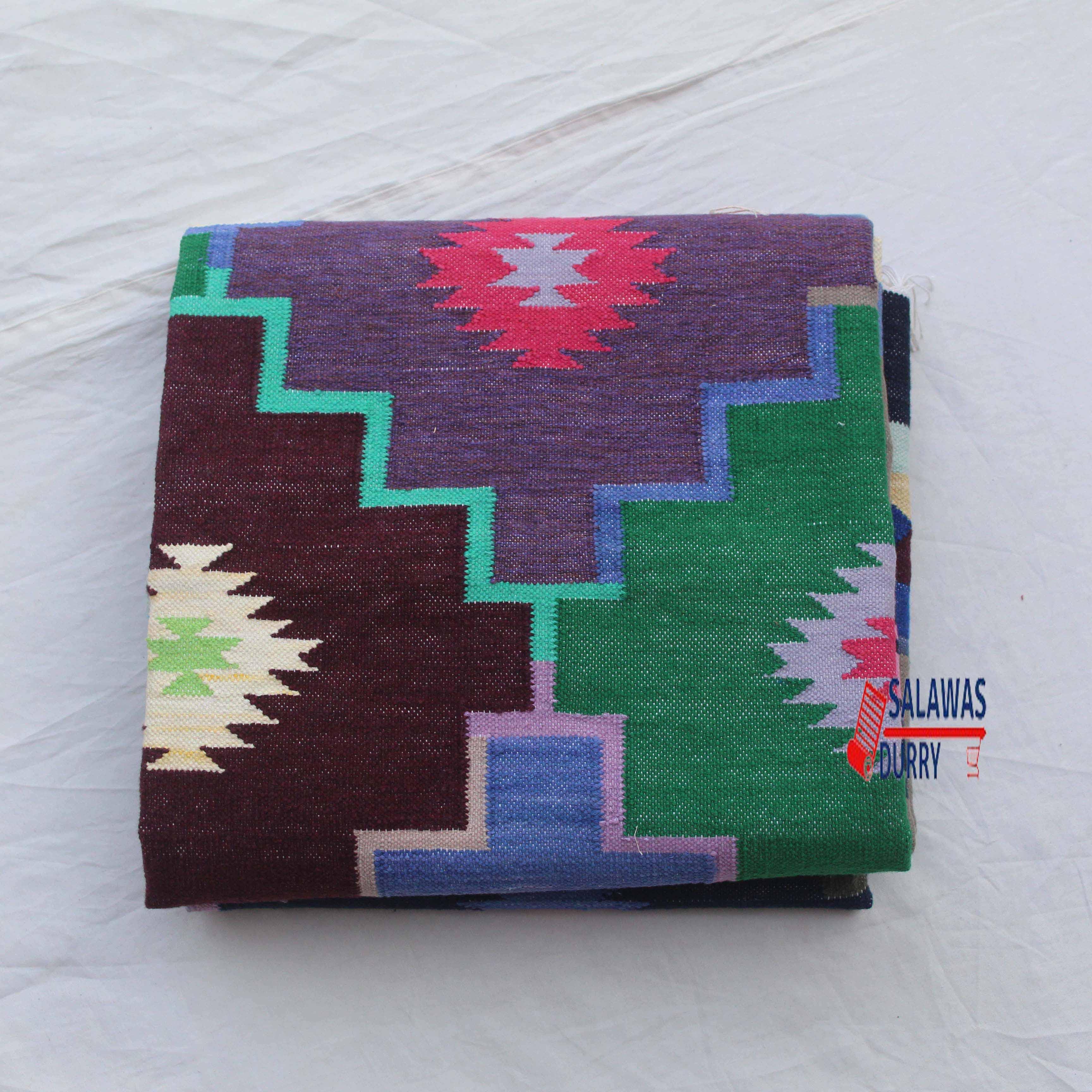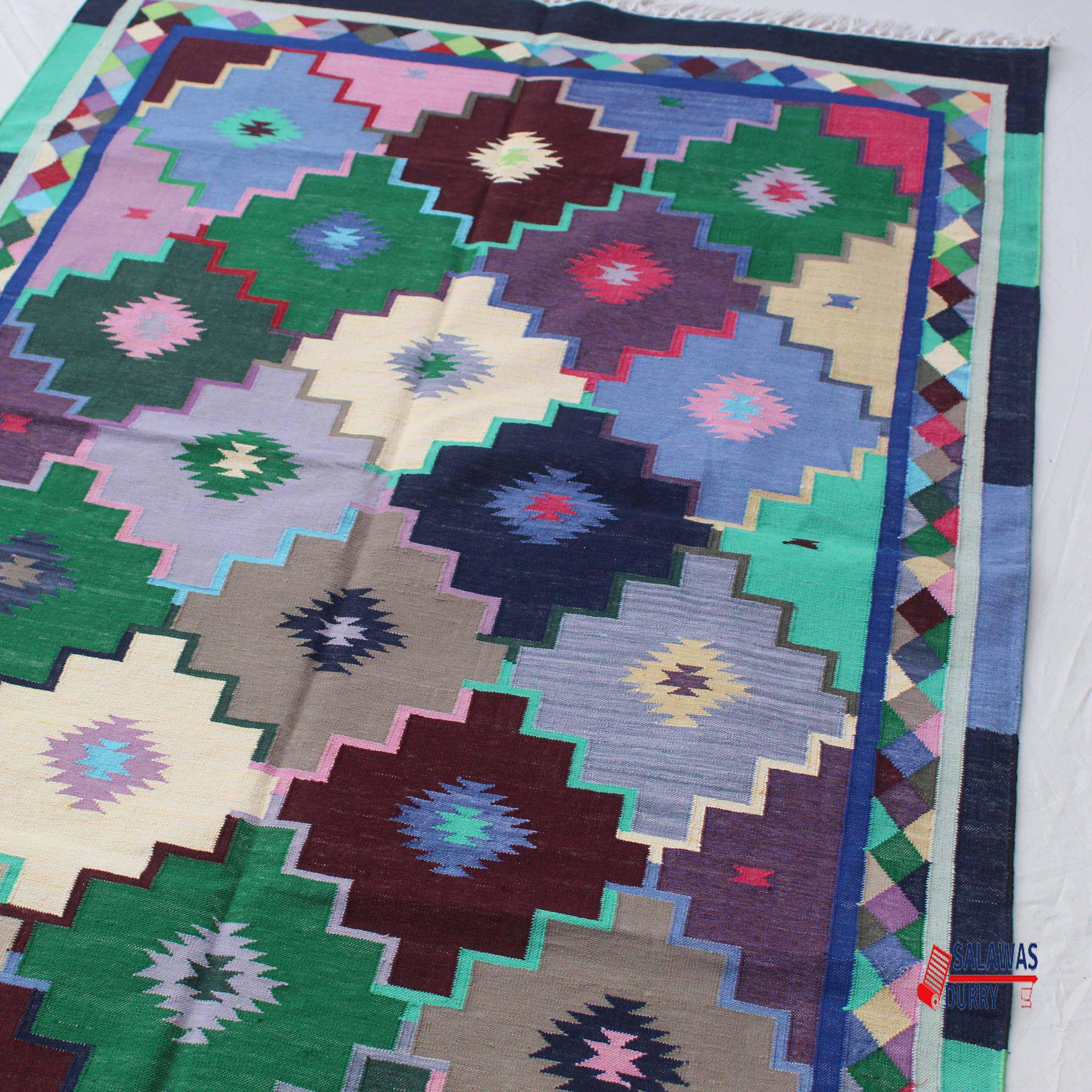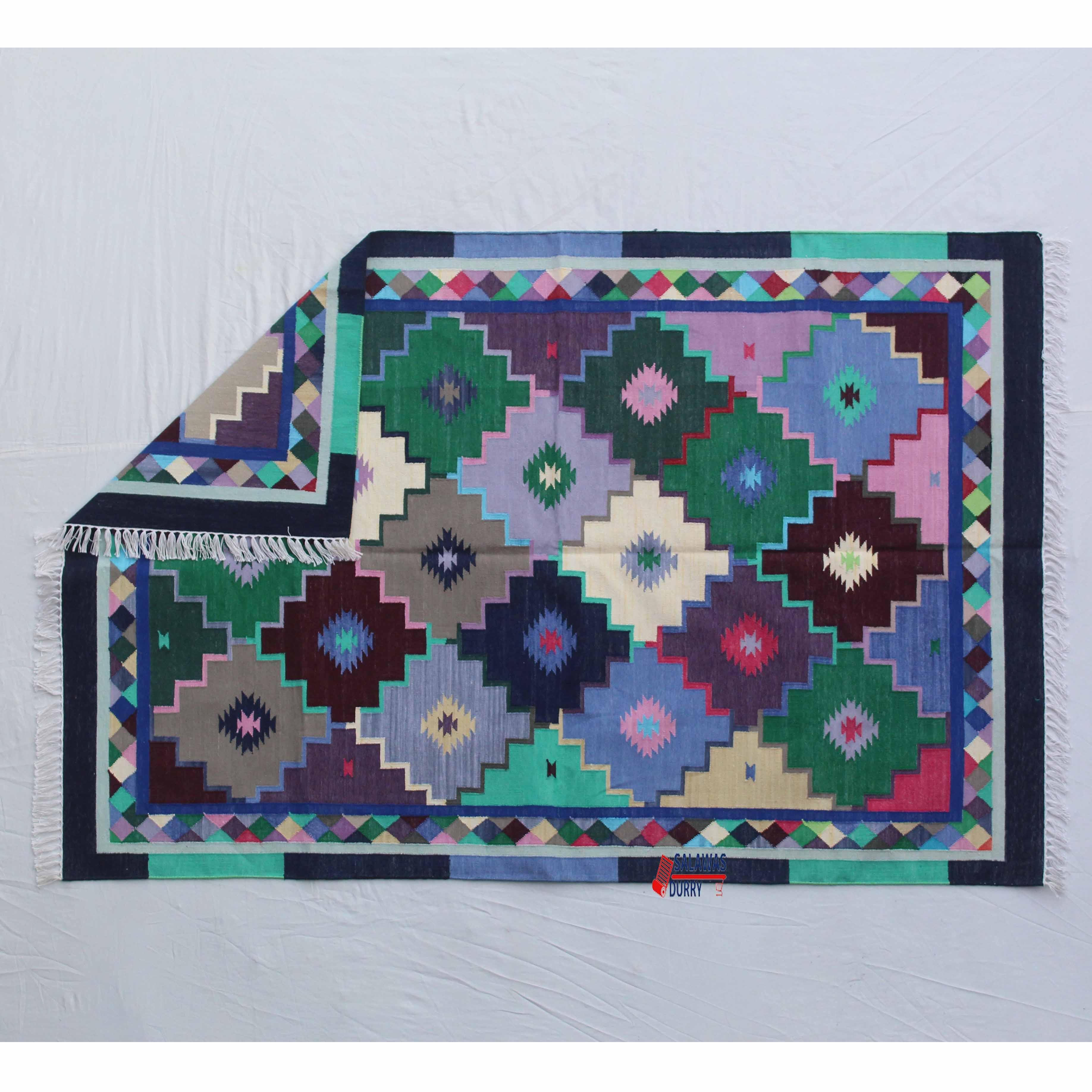 This Colorful Geometric Dhurrie Rug is perfect for enhancing the aesthetic appeal of living rooms, bedrooms, dining areas, or any other space in need of a pop of color and pattern. The reversible design allows you to change the appearance of the rug as desired, ensuring it complements your decor scheme effortlessly.