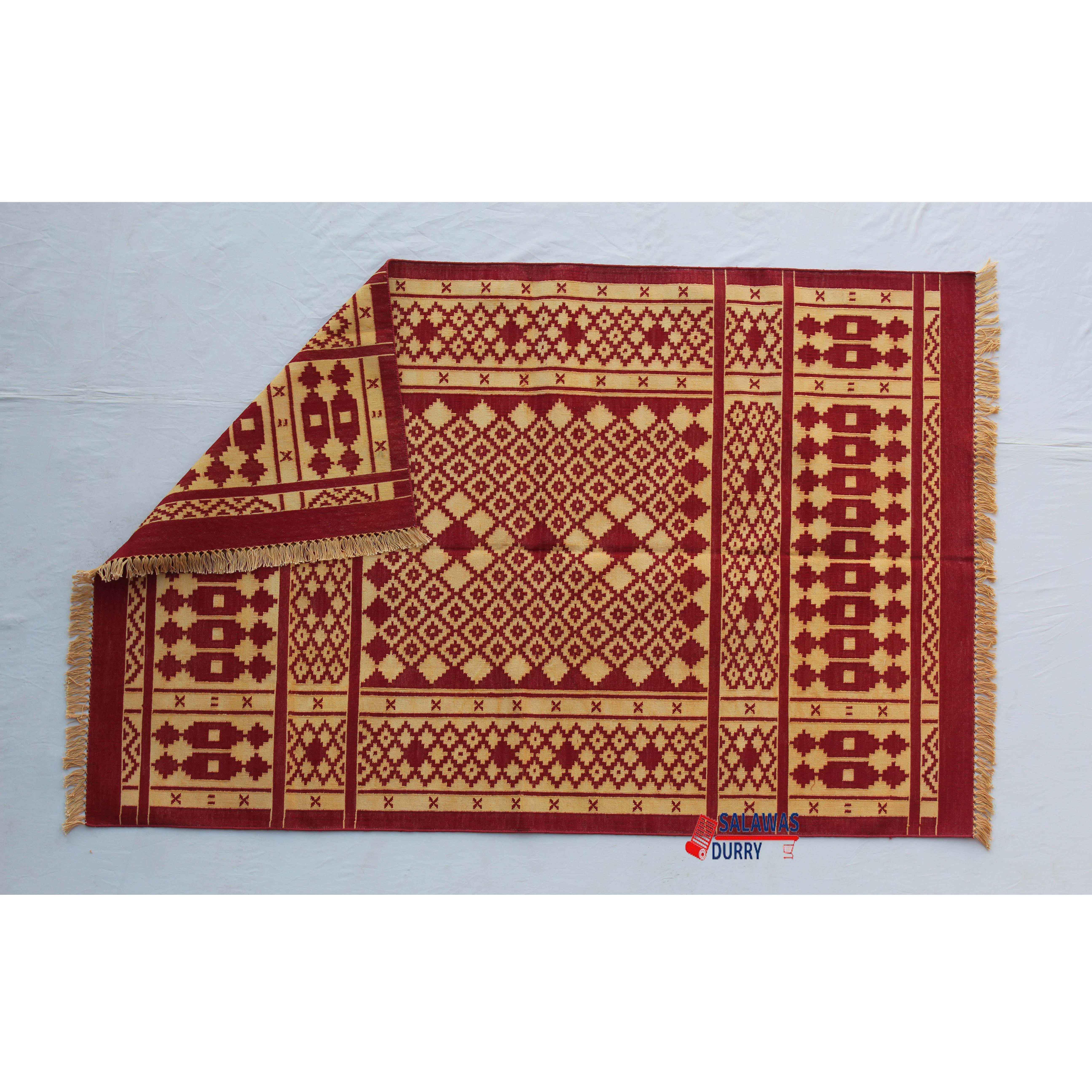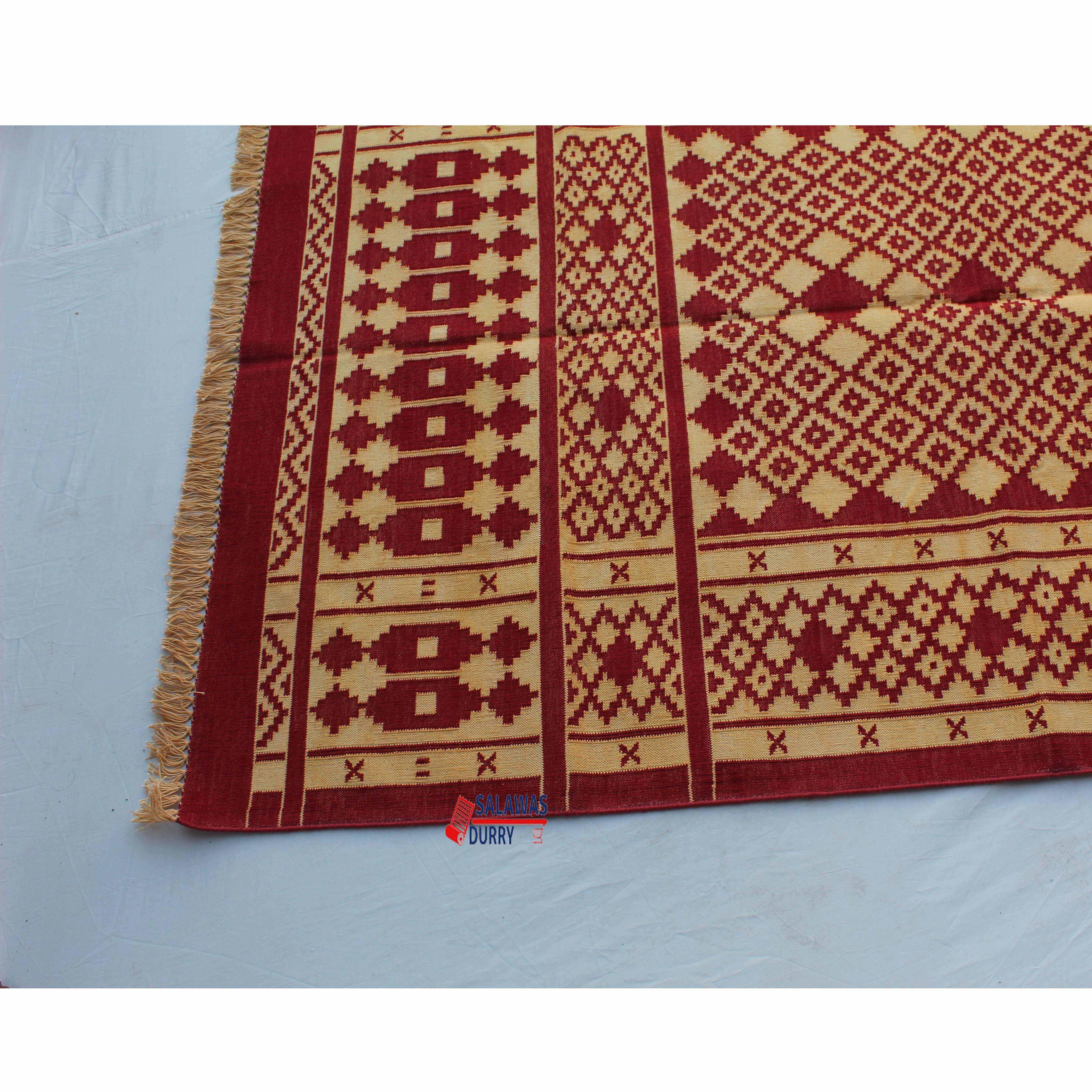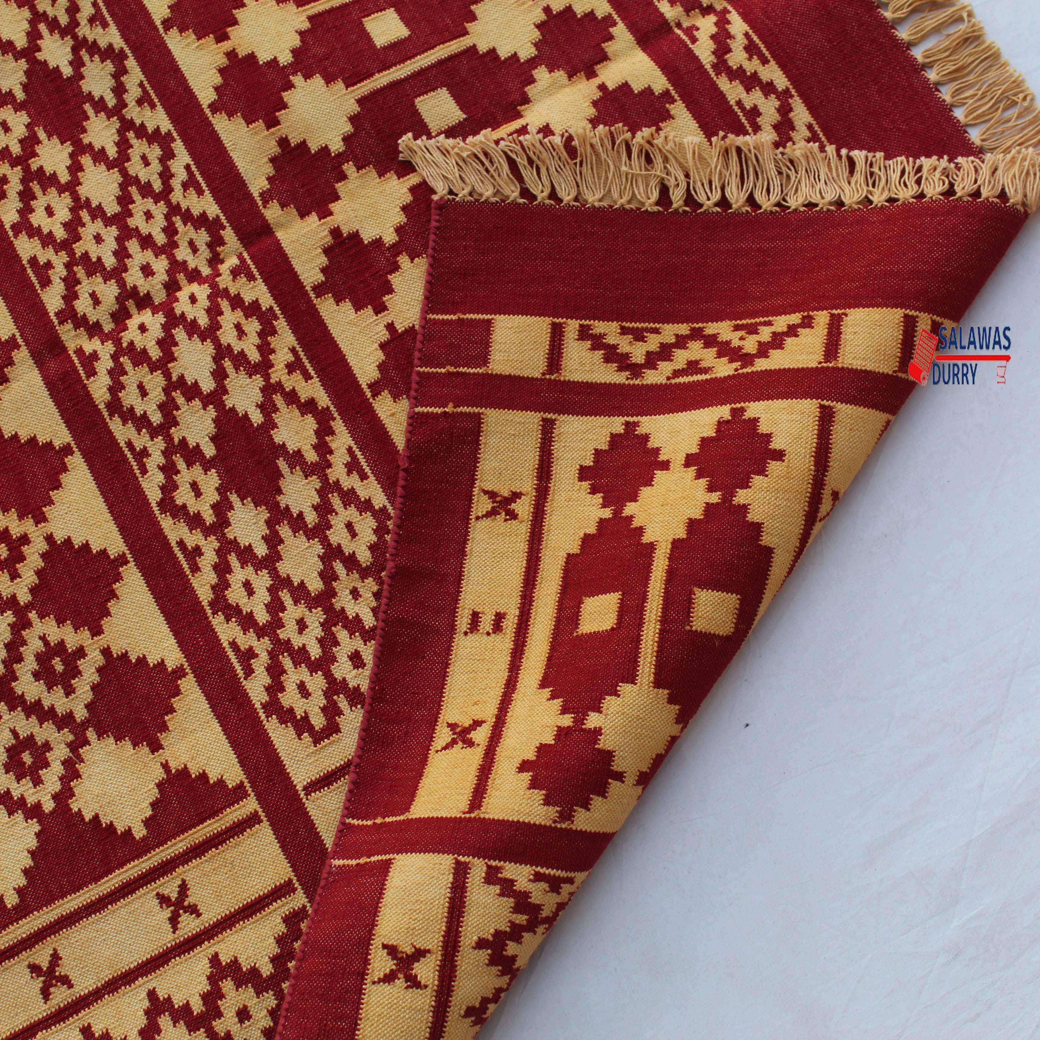 The 4x6 Cotton Red and Golden Yellow Rug is a premium design handwoven reversible Dhurrie rug kilim. Made from 100% cotton, this rug is carefully crafted using traditional loom techniques. The strong and vibrant Red and Golden Yellow colors are created using natural dye threads, ensuring a fast and long-lasting color that is completely washable without any color bleeding. The rug is lightweight yet tightly made, making it an excellent choice for floor covering. Its size of 4x6 feet is versatile to fit various spaces.