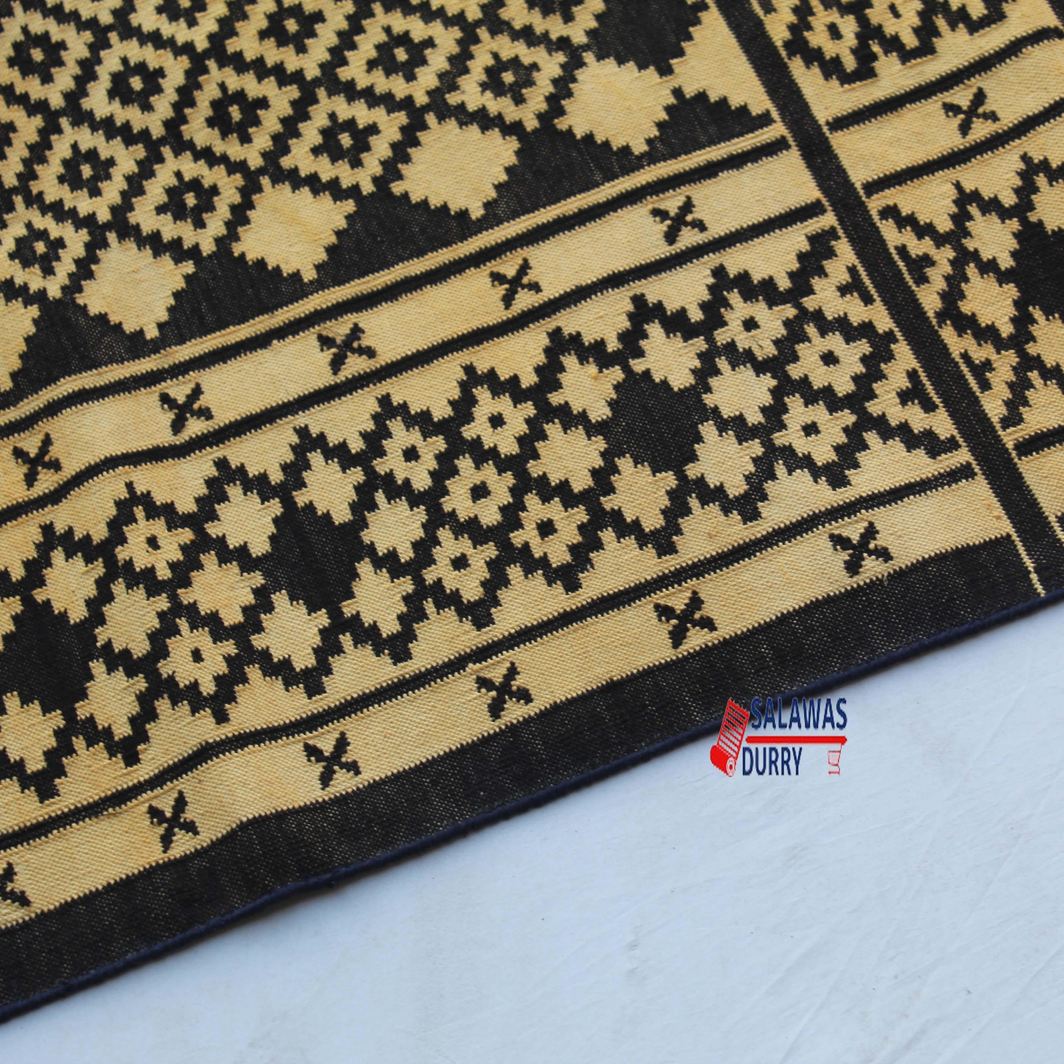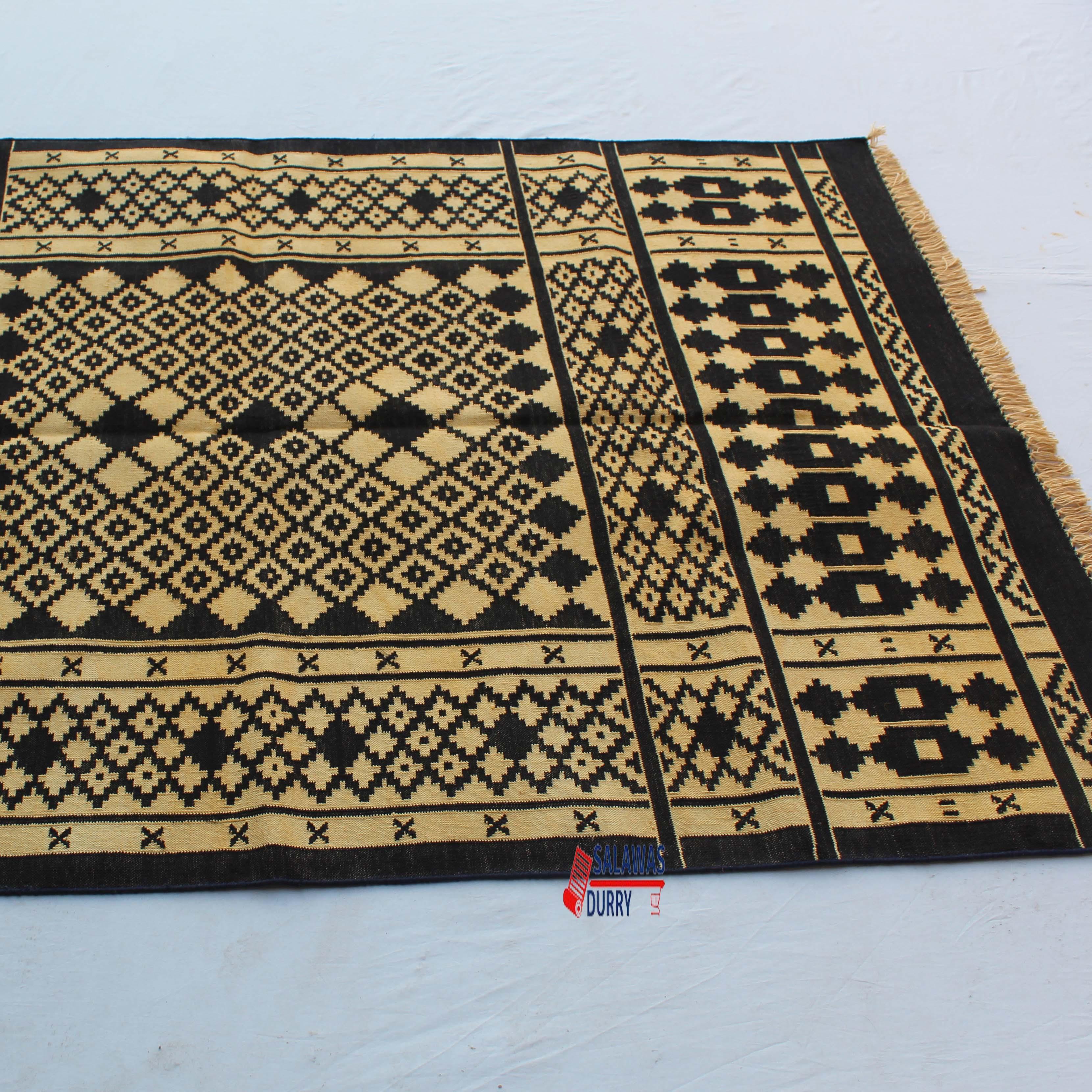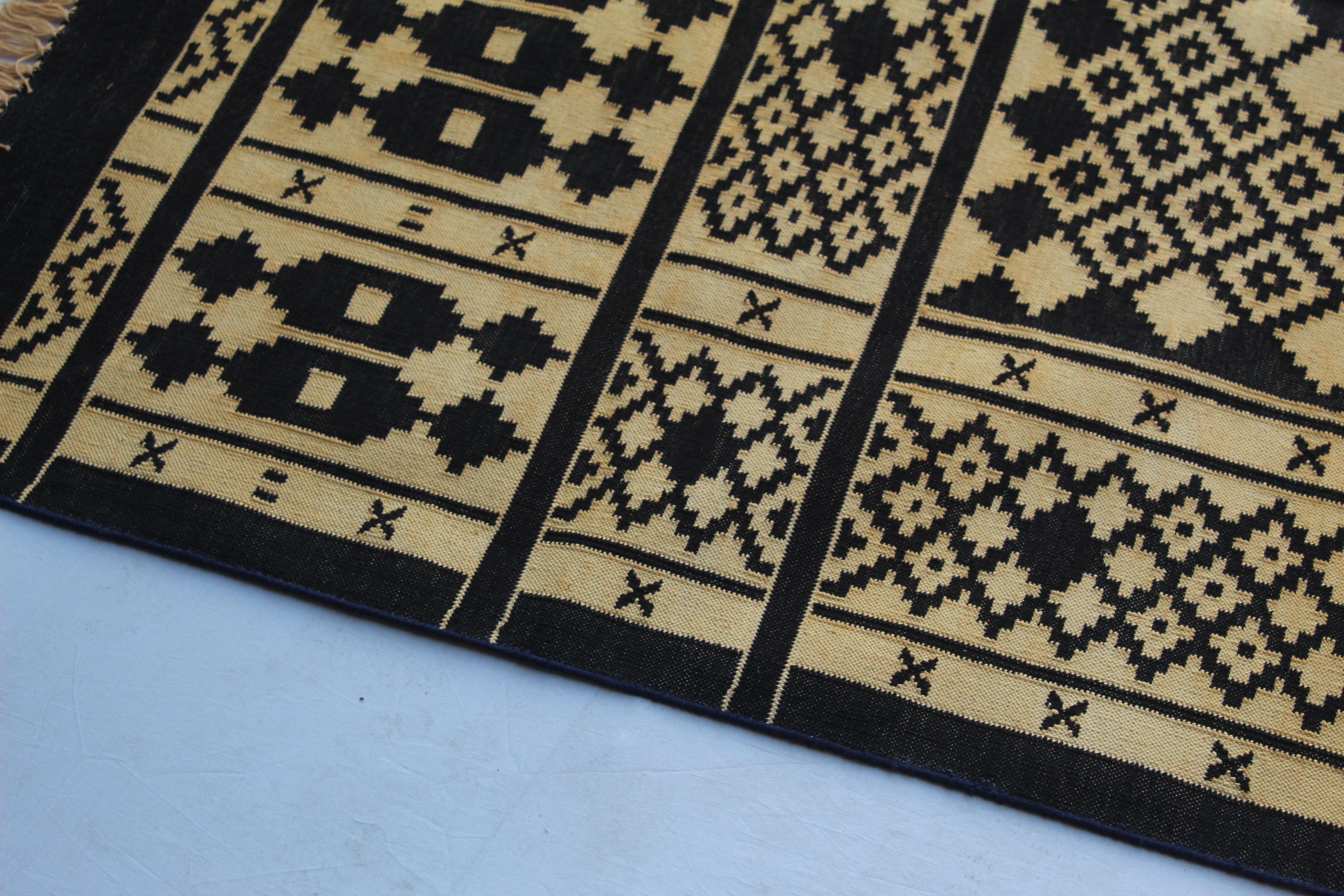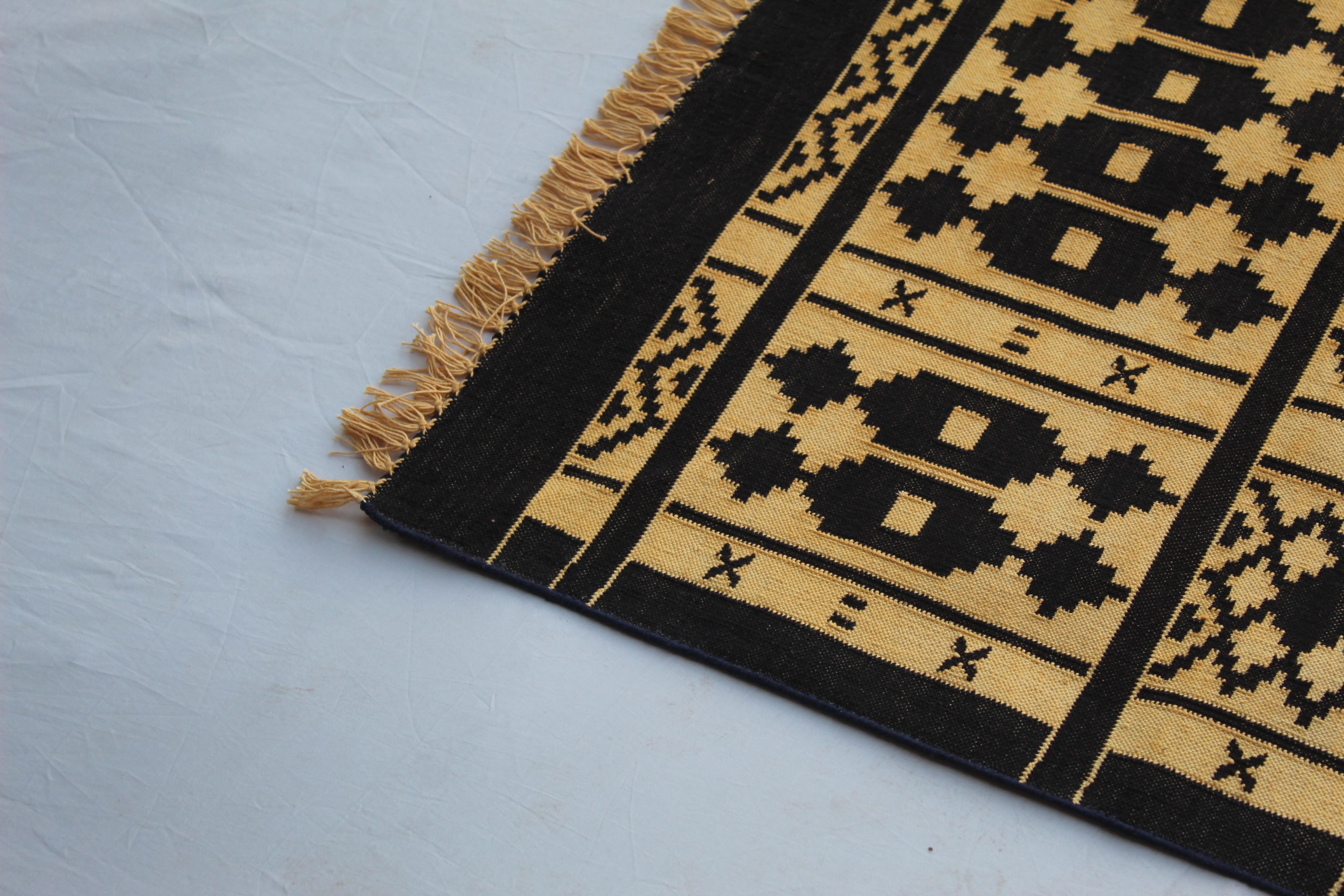 The 4x6 Cotton Black And Golden Yellow Rug is a premium design handwoven reversible Dhurrie rug kilim. Made from 100% cotton, this rug is carefully crafted using traditional loom techniques.