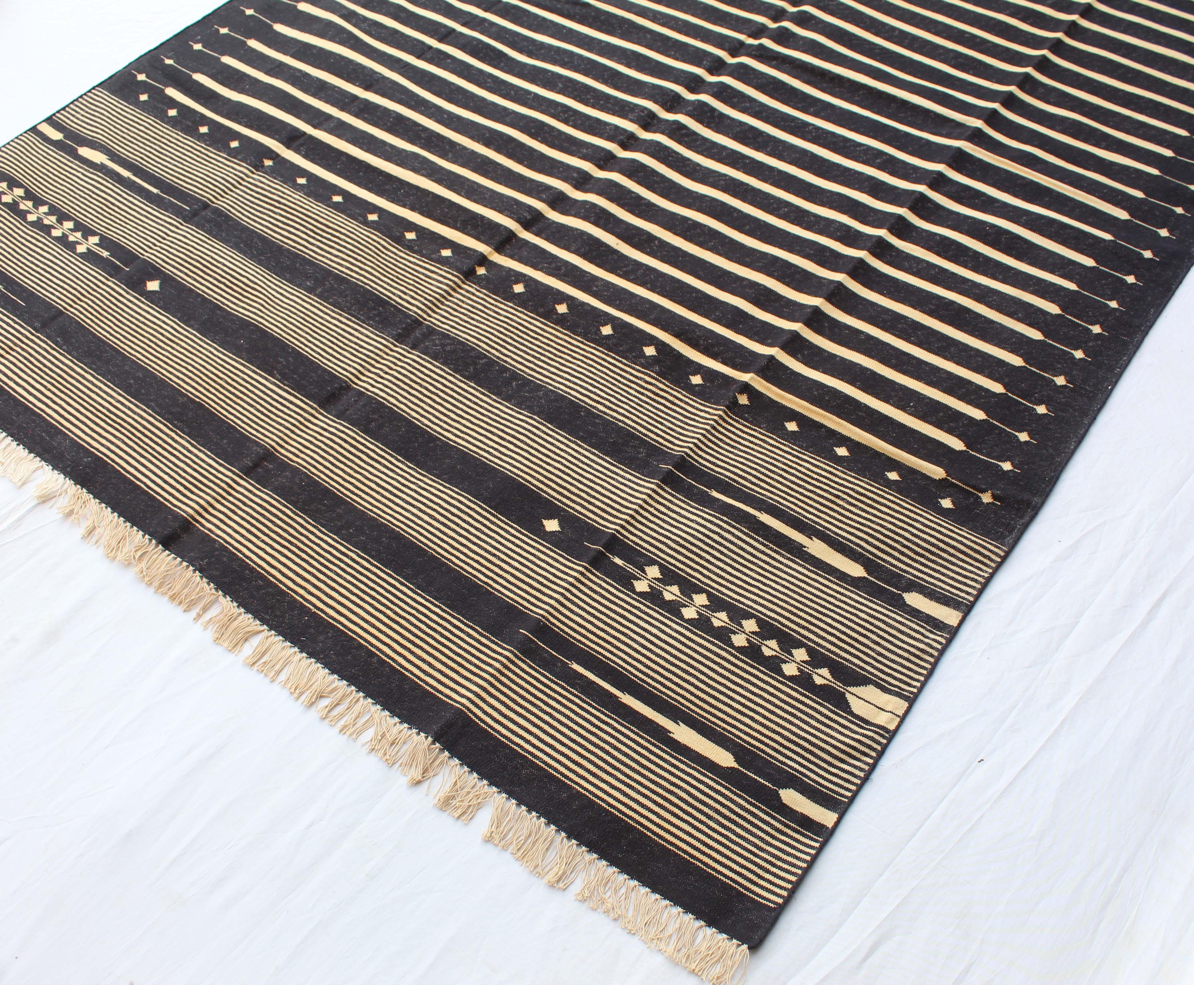 The 6X9 Black Hand Woven Stripes Geometric High Quality Cotton Flatweave Rug is a stunning addition to any space. This rug, handmade in India, is inspired by modern contemporary lifestyles and arts. Measuring 6 feet in width and 9 feet in length, it features a beautiful geometric design that adds a touch of sophistication to the room.