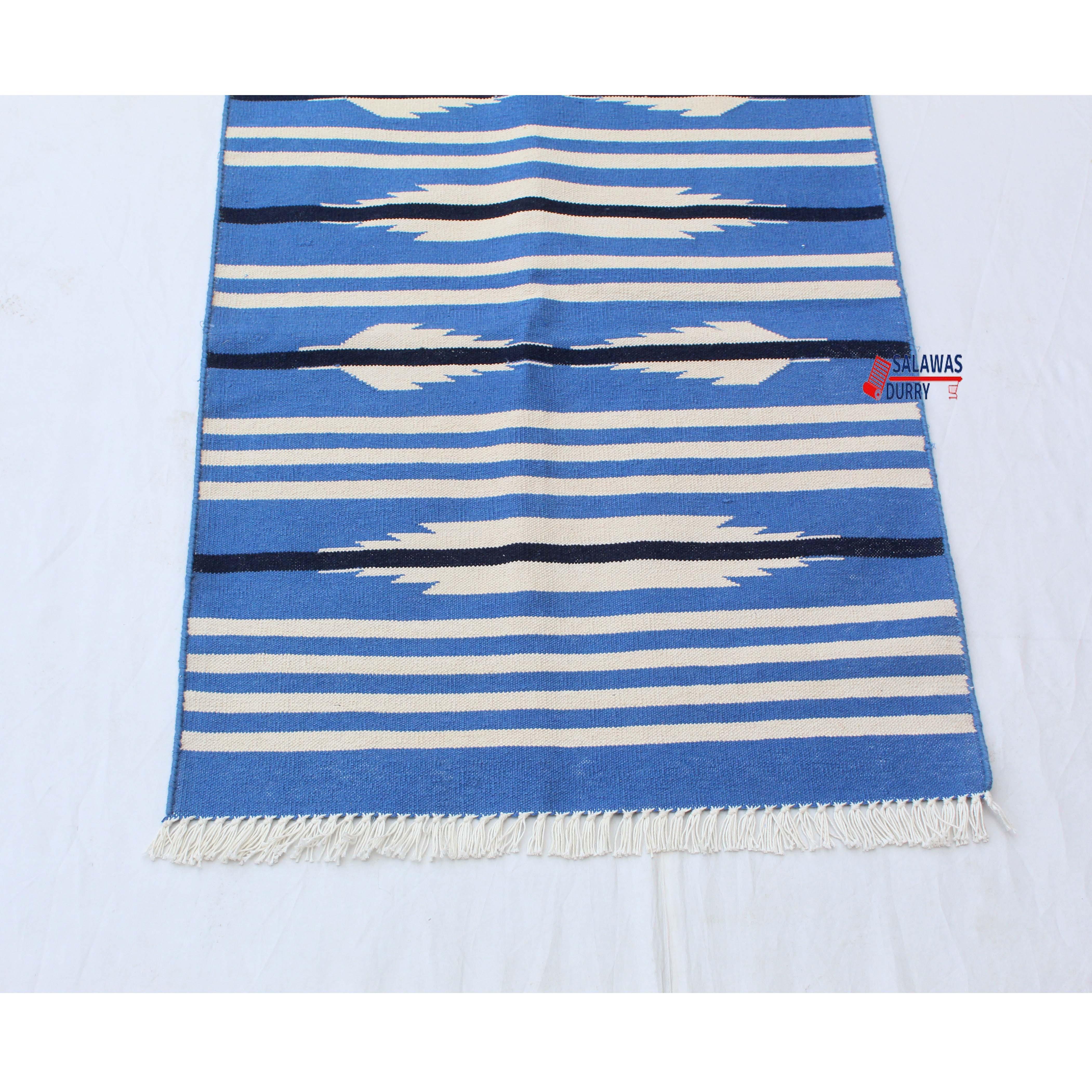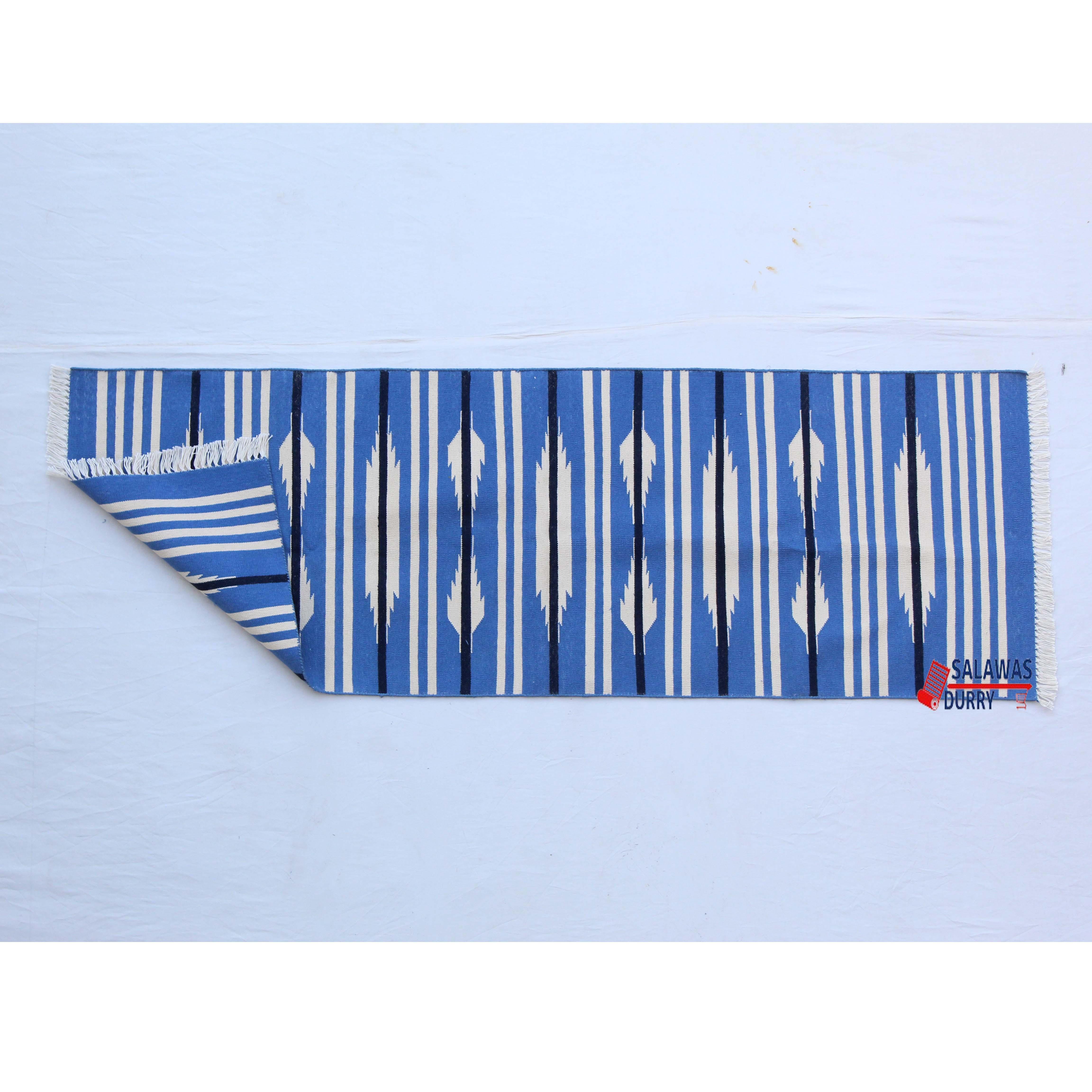 Introducing our exquisite Multiple Sizes Cotton Sky Blue And White Modern Stripes Handwoven Runner Rug! This reversible runner kilim rug is skillfully handcrafted, making it a unique and eye-catching addition to your home decor. Made from premium quality cotton materials, this runner rug offers both durability and comfort.