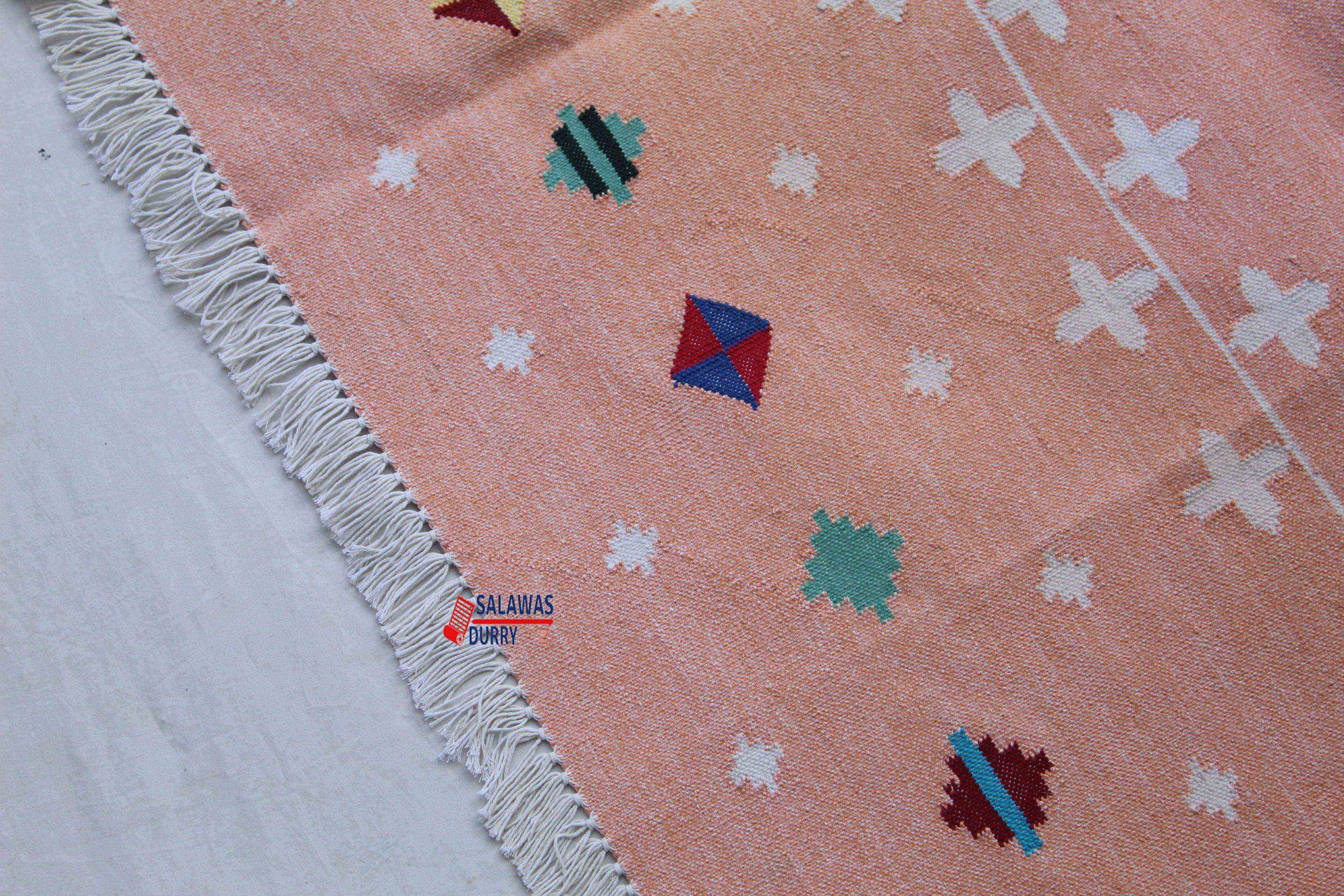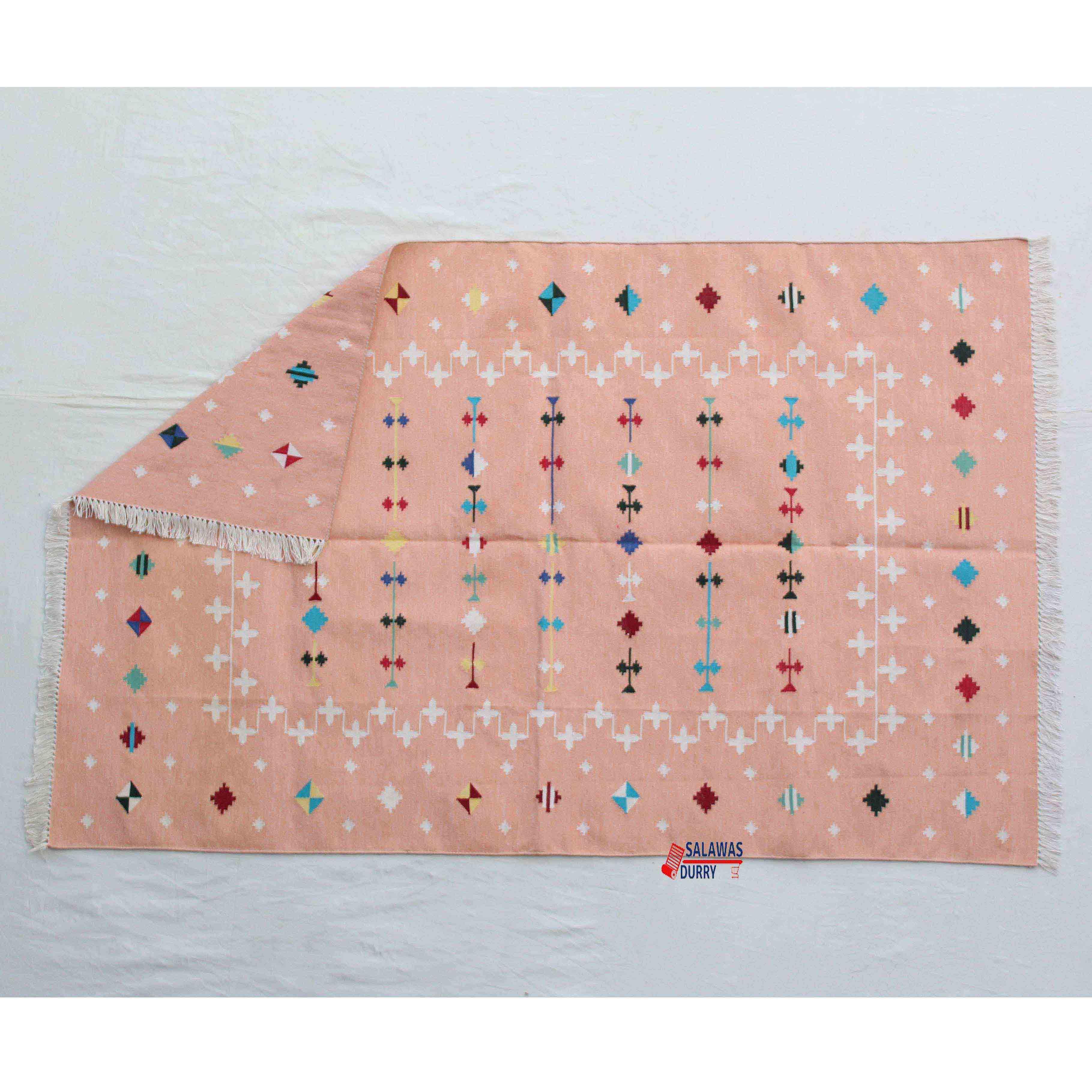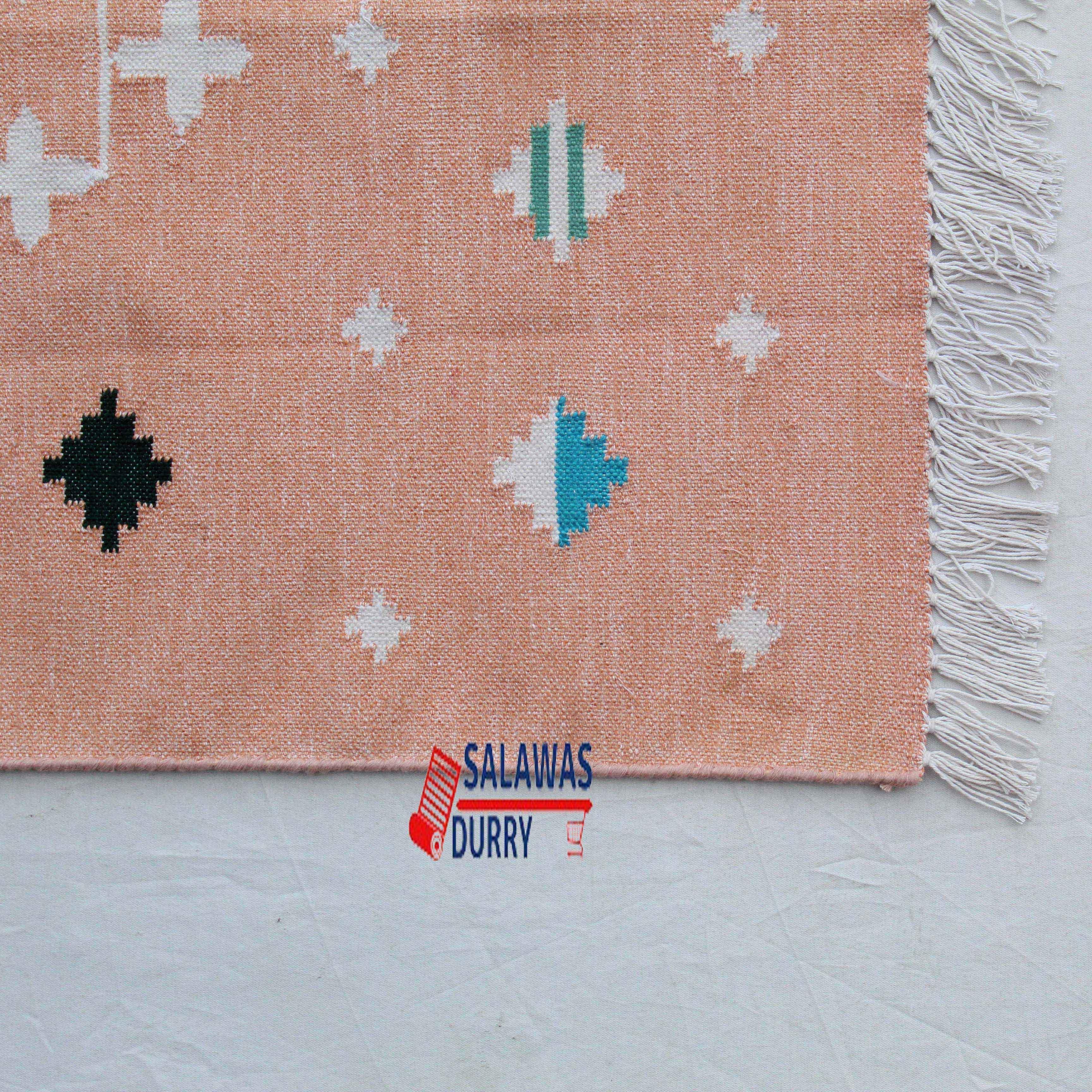 Introducing our exquisite Multi Sizes Blush Pink And White Cotton Handmade Modern Kilim Rug that will instantly elevate the style of any room in your home. This rug is skillfully handwoven using traditional loom techniques by talented artisans in India.